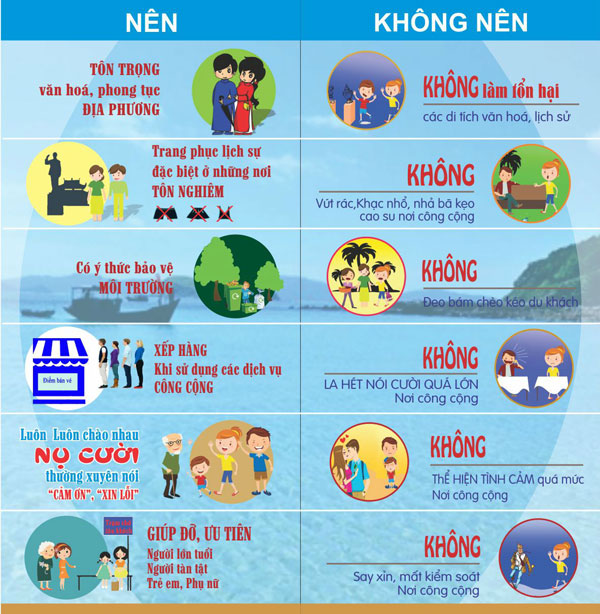 8. Có ý thức giữ gìn an ninh trật tự, bảo vệ môi trường, tiết kiệm năng lượng; giữ gìn, bảo vệ công trình văn hóa, kiến trúc, cảnh quan khi đi du lịch. Không khắc, vẽ lên tường, tượng, công trình kiến trúc; không hái hoa, chặt phá cây cối… tại các điểm di tích, danh lam thắng cảnh.