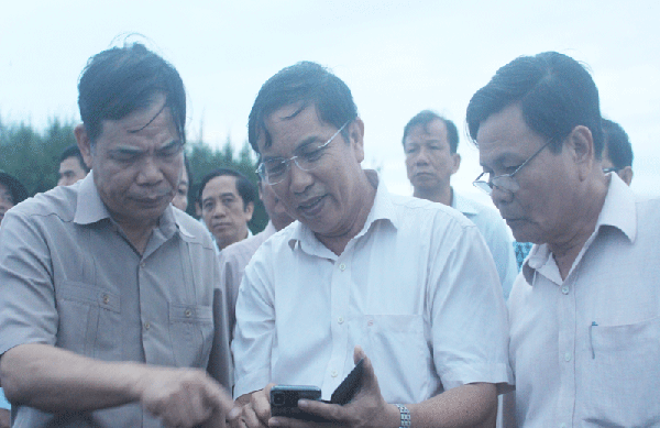 Lãnh đạo tỉnh Bến Tre chỉ cho bộ trưởng biết những điểm sạt lở nghiêm trọng đang xảy ra trên địa bàn.