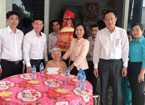 Bà Trương Thị Bích Hạnh (thứ 3 từ phải sang), Ủy viên Thường vụ, Trưởng ban Tuyên giáo Tỉnh ủy, tặng quà tết mẹ Việt Nam anh hùng Võ Thị Phận tại khu phố 4, phường Mỹ Phước, TX.Bến Cát