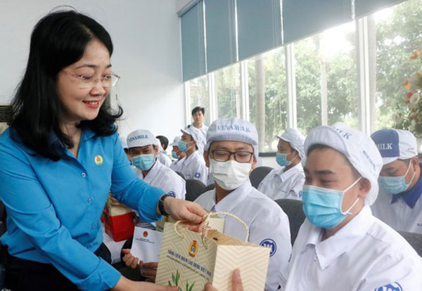 Bà Nguyễn Thị Kim Loan - Chủ tịch LĐLĐ tỉnh Bình Dương Chủ tịch liên đoàn lao động tỉnh Bình Dương trao quà cho công nhân Công ty Vinamilk