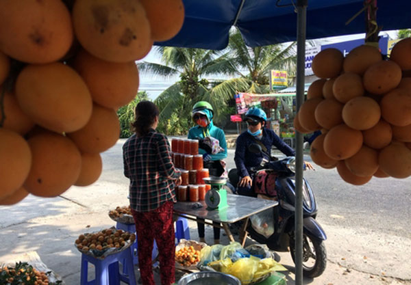 Từ tết đến nay, đi dọc đường dẫn lên cầu Cần Thơ, người lưu thông dễ bắt gặp những sắc trái vàng, xanh, tím dọc các lều ven lộ. Đó là trái thanh trà, mận xanh đường, vú sữa các loại người dân sở tại bán cho khách ngược xuôi.