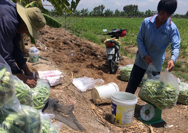 Rẫy đậu bắp của nhà ông Đỗ Hoàng Minh ở ấp Đông Hòa 2 đang mùa thu hái, lái đến tận rẫy cân mua.