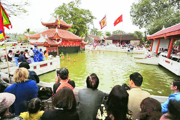 Khán giả xem múa rối nước tại thủy đình làng Đào Thục, huyện Đông Anh. Ảnh: Khánh Lan