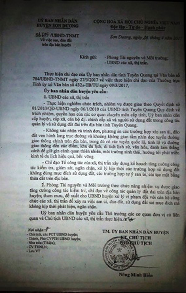 Như vậy có hay không việc phớt lờ văn bản số 605/UBND-TNMT ký ngày 24/4/2017 của UBND huyện Sơn Dương về việc: “Không xác nhận và trình đơn, phương án các trường hợp xin san ủn, đào đất ven hành lang trục đường và khoảng không gian tầm nhìn dọc tuyến đường giao thông chính trên địa bàn, trong đó có các tuyến quốc lộ, tỉnh lộ và đường giao thông đến các điểm, khu du lịch, di tích lịch sử, văn hóa, danh lam thắng cảnh để giữ gìn cảnh quan thiên nhiêu, môi trường sinh thái, hướng tới phát triển kinh tế du lịch hiệu quả bền vững. Chỉ đạo Tổ công tác của xã, thị trấn xây dựng kế hoạch tăng cường công tác kiểm tra, giám sát, ngăn chặn, xử lý kịp thời các trường hợp sử dụng đất không đúng mục đích sử dụng đất, các trường hợp tự ý san ủn cải tạo mặt bằng thửa đất trên địa bàn”.