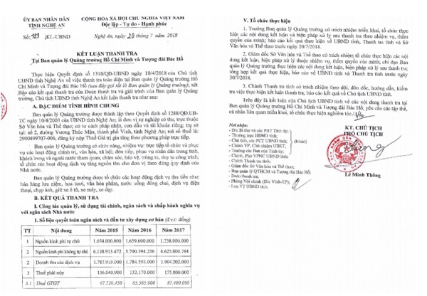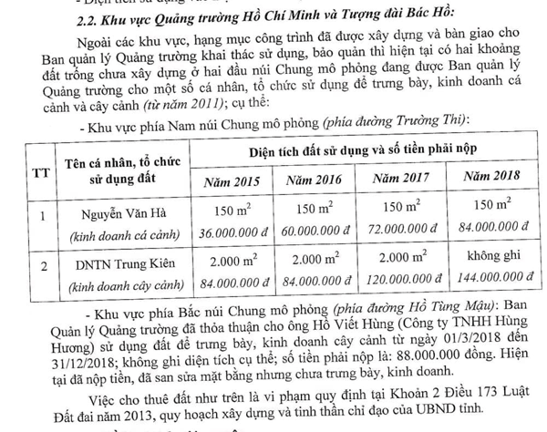 Sau gần 4 tháng thanh tra, ngày 20/7/2018, UBND tỉnh Nghệ An đã có kết luận số 489/KL - UBND do Phó Chủ tịch UBND tỉnh Lê Minh Thông ký trong đó về Công tác quản lý, sử dụng đất và quy hoạch xây dựng đã khẳng định: “Việc cho thuê đất trên là trái quy định pháp luật”. Kết luận nêu rõ: “Ngoài các khu vực, hạng mục công trình đã được xây dựng và bàn giao BQL Quảng trường khai thác, sử dụng, bảo quản thì hiện tại có hai khoảng đất trống ở hai đầu núi Chung mô phỏng đang được BQL cho một số cá nhân, tổ chức thuê sử dụng để trưng bày, kinh doanh cá cảnh và cây cảnh (từ năm 2011) cụ thể: Khu vực phía Nam núi Chung mô phỏng (phía đường Trường Thi) cho DNTN Trung Kiên thuê 2000 m2 kinh doanh cây cảnh với giá 144.000.000 đồng/năm và hộ ông Nguyễn Văn Hà (kinh doanh cá cảnh) thuê 150m2 với giá 84.000.000 đồng/năm (số liệu 2018).