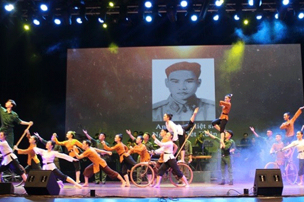Tiết mục "Bước chân trên dải Trường Sơn" do diễn viên, nghệ sĩ Nhà hát Nghệ thuật tỉnh biểu diễn - một tiết mục tham dự Liên hoan “Tiếng hát Đường 9 xanh - 2019”. Ảnh: laodong.vn