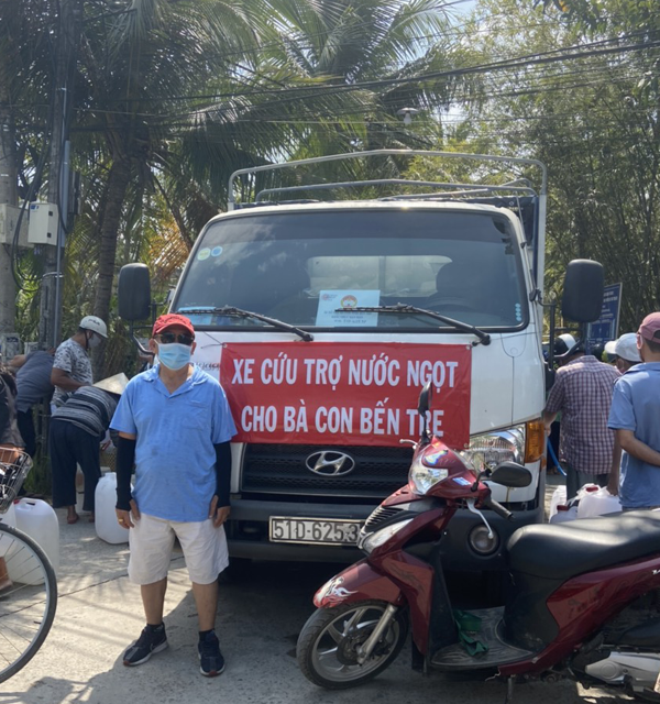 Tạp chí điện tử Văn hiến Việt Nam đã phối hợp các nhóm mạnh thường quân của anh Trần Văn Hoàng, Nguyễn Ngọc Hóa và nhóm bằng hữu đường xa trực tiếp mang nước ngọt đến tất cả các ấp - xã thuộc huyện Châu Thành đợt 1 khoảng 10.000m³. Khi được hỏi dịch Covid-19 đang bùng phát, đi cứu trợ như vậy các anh có ngại và sợ không? Anh Trần Văn Hoàng đại diện nhóm tần ngần lát sau trả lời: Sợ lắm chứ, nhưng thấy bà con mình múc nước dưới ao nhiễm mặn lên lắng phèn đem về uống tui thấy thương đứt từng đoạn ruột, tui quyết định cùng anh em nhân viên, tài xế trong nhóm chung tay giúp bà con không nhận thù lao, lương, chịu toàn bộ chi phí tiền mua nước, nhân công, phương tiện vận chuyển, phát miễn phí cho những ai thực sự nghèo trên 300 bình đựng nước (loại 30 lít/bình). Dĩ nhiên trong quá trình vận chuyển, tiếp cận bà con, chúng tôi tuân thủ nghiêm ngặt theo hướng dẫn của nghành y tế như: Nước sát trùng rửa tay thường xuyên, đeo khẩu trang, làm việc có khoảng cách…