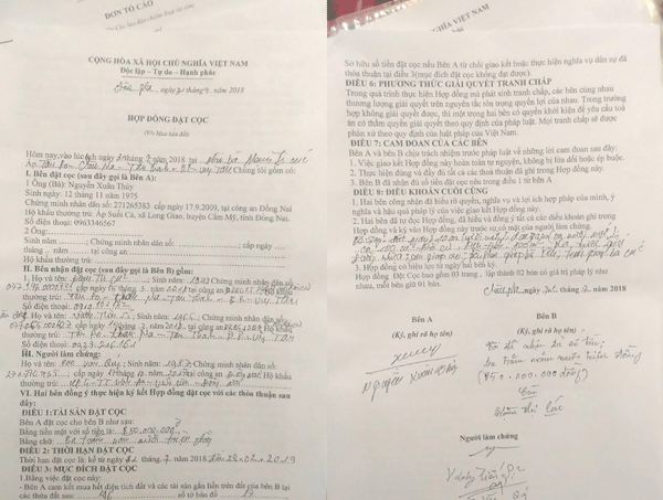 Theo yêu cầu của bà Cúc, hai bên đồng ý Xác lập Hợp đồng đặt cọc có nội dung phong thủy khi đặt cọc cho bà Cúc số tiền 350 triệu đồng, bên bán có trách nhiệm chịu mọi chi phí làm thủ tục lên đất thổ cư, tách thửa để sang nhượng cho bên mua. Thời hạn cuối cùng là ngày 28/02/2019.