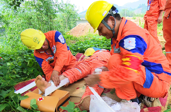 Tình huống diễn tập giả định được đặt ra là sự cố vỡ sứ DCL đầu TBA tại 01 TBA thuộc DDZ 35KV sau MC 371 Tổ 2 thuộc lộ 371A14.0 hư hỏng và cần thay thế ngay để khôi phục điện trở lại. Tình huống hai, cấp cứu người công nhân không may ngã cao, chấn thương cẳng chân khi đang trèo cột làm việc trên cao để sửa chữa lưới điện.