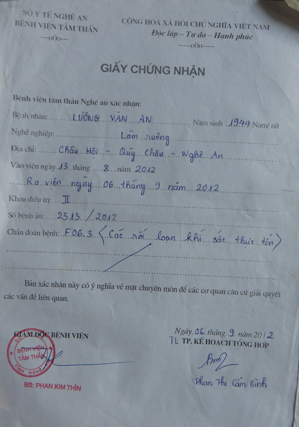 Giấy chứng nhận của Bệnh viện tâm thần Nghệ An