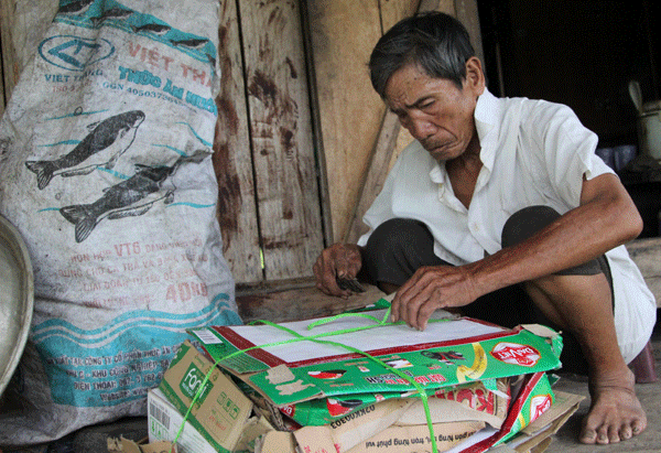 Hiện tại, mỗi tháng ông Xin được hưởng trợ cấp 540.000đ (chế độ dành cho người bị thần kinh, tâm thần). Hàng ngày, ông Xin đi mua phế liệu, giấy vụn, ống bia… rồi mang lên thị trấn Tân Lạc (Quỳ Châu), bán lại kiếm tiền mua gạo.