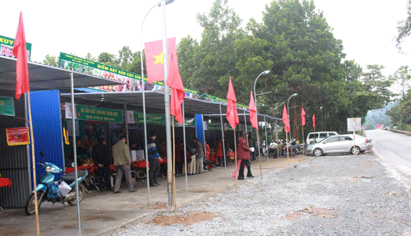 Các gian hàng bày bán sản phẩm cam Sành được UBND huyện Vị Xuyên hỗ trợ kinh phí xây dựng tại Km 31, xã Việt Lâm; giúp các hộ trồng cam tiêu thụ sản phẩm.