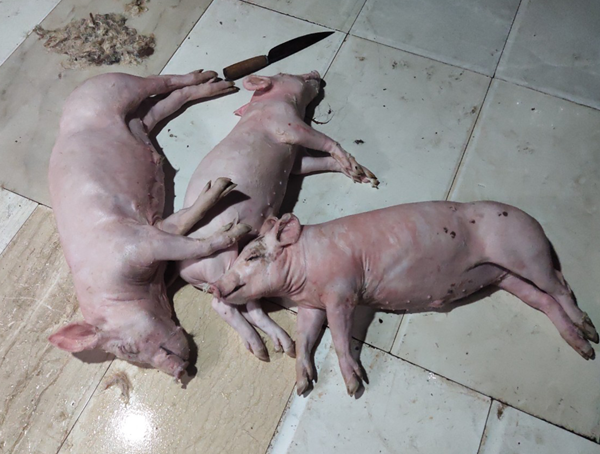 Qua quá trình trinh sát, nắm bắt địa bàn; vào hồi 13 giờ 30 chiều nay 23/3, Phòng Cảnh sát môi trường (Công an tỉnh Hà Tĩnh) đã phối hợp với Công an TP Hà Tĩnh, Trạm thú y thành phố và UBND xã Thạch Bình bắt quả tang cơ sở chuyên quay thịt lợn của ông Nguyễn Văn Vinh, có địa chỉ tại Xóm Mới, xã Thạch Bình (TP Hà Tĩnh) đang có hành vi mua 03 con lợn chết về chuẩn bị giết mổ với các triệu chứng: Lợn chết xuất huyết màu tím tái toàn thân, không đảm bảo an toàn vệ sinh thực phẩm, không rõ nguồn gốc xuất xứ.