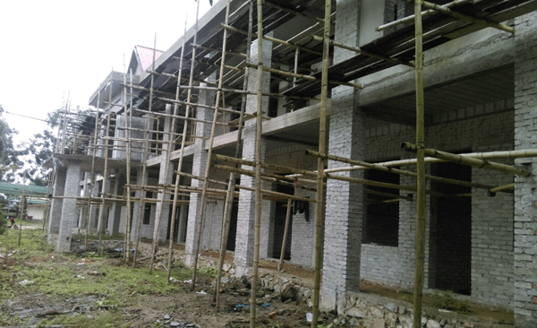 Khoảng cách từ sân chơi của học sinh đến công trình chỉ cách một bước chân nhưng không có vách ngăn an toàn; hệ thống giàn giáo bằng tre mục rữa rất nguy hiểm nếu học sinh đi vào khu vực này. Ảnh: Sỹ Thông