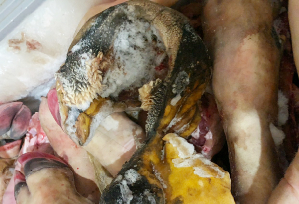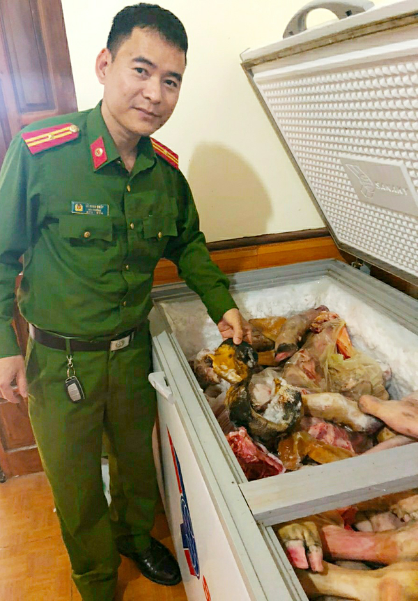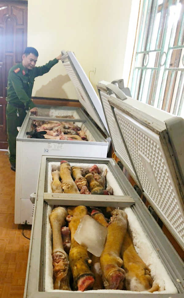 Theo đó, vào hồi 16h30 ngày 24/2/2020, phòng Cảnh sát Môi trường (Công an tỉnh Hà Tĩnh) chủ trì phối hợp với Công an huyện Vũ Quang, chính quyền UBND xã Ân Phú (huyện Vũ Quang) phát hiện tại nhà bà Phạm Thị Minh Thành (39 tuổi, trú tại thôn 2, xã Ân Phú) đang có hành vi tàng trữ 210kg sản phẩm động vật, gồm: chân bò, đuôi bò, tai bò không rõ nguồn gốc xuất xứ, không đảm bảo vệ sinh thú y.