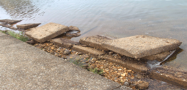 Hiện nay, tấm lát bê tông cũ có kích thước từ cao trình +25 trở xuống đã bị xuống cấp, một số tấm bị đứt gãy nghiêm trọng với chiều dài khoảng 700m. Phần tiếp giáp giữ tấm bê tông mới và tấm bê tông cũ đã bị sóng đánh làm mất liên kết, một phần đất đá, sỏi dưới tấm bê tông mới từ cao trình +25 trở lên đã bị nước cuốn đi tạo thành những điểm hở “hàm ếch”, dễ làm sập các tấm bê tông nói trên. Về lâu dài nếu không khắc phục hiện tượng sụt lún trên sẽ dễ gây mất an toàn công trình.
