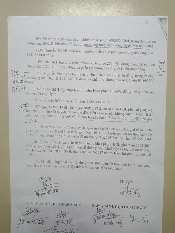 Theo đó ông Hồ Minh Mậu chịu trách nhiệm khắc phục 800 triệu đồng, bà Hồ Thị Hằng 200 triệu đồng, ông Nguyễn Văn Lực 200 triệu đồng, bà Hồ Thị Thủy kế toán quỹ 40 triệu đồng, bà Nguyễn Thị Hà Trưởng BQL Qũy HTND hiện tại chịu trách nhiệm khắc phục hơn 240 triệu đồng. Tổng số tiền BQL nhận khắc phục là hơn 1,4 tỉ đồng. Biên bản ghi rõ: “Từ ngày 15/09/2017 đến hết ngày 30/09/2017 tất cả cá nhân BQL phải cố gắng vay tiền mặt trả tiền vào quỹ để trả nợ cho dân. Nếu cá nhân nào không vay đủ tiền mặt thì phải nhận nợ chung trong quỹ và trả phí, trả gốc theo kế hoạch lộ trình triệt tiêu quỹ HTND”.