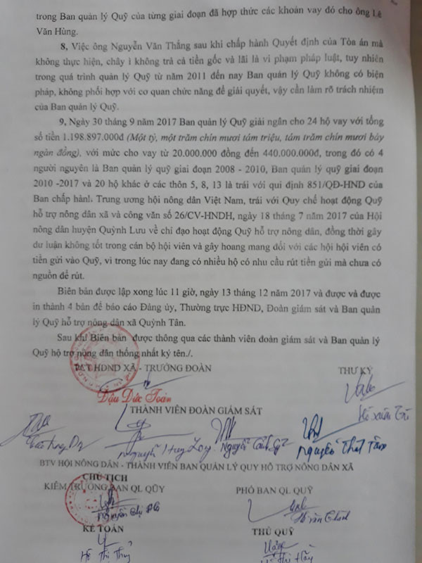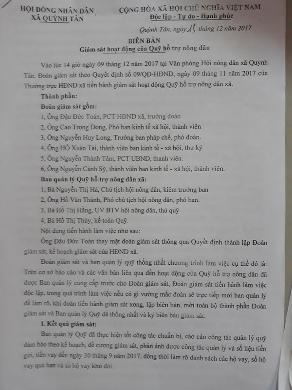 Biên bản giám sát hoạt động của Qũy HTND của HĐND xã Quỳnh Tân ngày 9/12/2017 còn khẳng định: “Qúa trình cho ông Hồ Bá Uyên vay từ 2008 đến nay với số tiền rất lớn, khó đòi. Tuy nhiên BQL Qũy HTND xã qua hàng năm không báo cáo, không công khai trong danh sách các hộ vay quá hạn, khó đòi nêu trên. Nhiều phiếu vay không đảm bảo quy trình, không đúng nguyên tắc tài chính, một người được vay nhiều khế, trong một ngày ông Uyên được vay 2 lần với số tiền lớn dẫn đến việc thu hồi vốn, phí không thu được nhưng không có biện pháp xử lý, khắc phục kịp thời”.