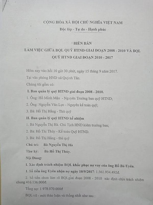 Do cho ông Hồ Bá Uyên chi hội 5 vay với số tiền quá lớn, sai nguyên tắc, dẫn đến khó thu hồi vốn và lãi nên ngày 15/9/2017, tại văn phòng Hội Nông dân xã Quỳnh Tân, BQL Qũy HTND giai đoạn (2008 - 2010) gồm: ông Hồ Minh Mậu - Nguyên Trưởng ban, ông Nguyễn Văn Lực - nguyên kế toán quỹ, bà Hồ Thị Hằng thủ quỹ đã làm việc với BQL Qũy kế nhiệm (2010 - 2017) để xác định trách nhiệm khắc phục nợ.
