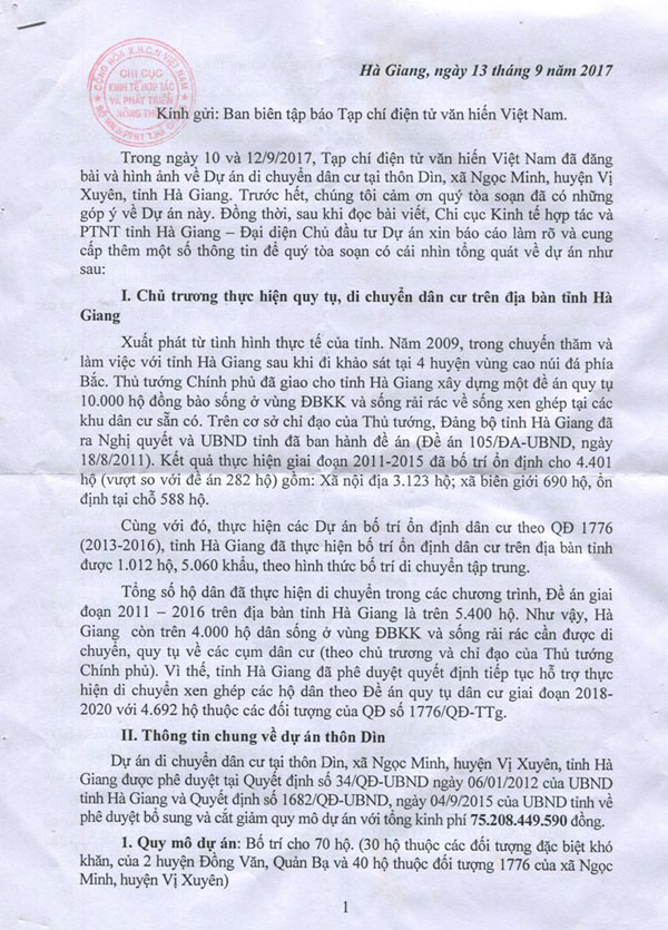 Văn bản của Chi cục Kinh tế hợp tác và phát triển nông thôn tỉnh Hà Giang – Đại diện chủ đầu tư Dự án Khu tái định cư thôn Dìn (xã Ngọc Minh, huyện Vị Xuyên gửi Tạp chí Điện Tử Văn hiến Việt Nam đề ngày 13/9/2017.