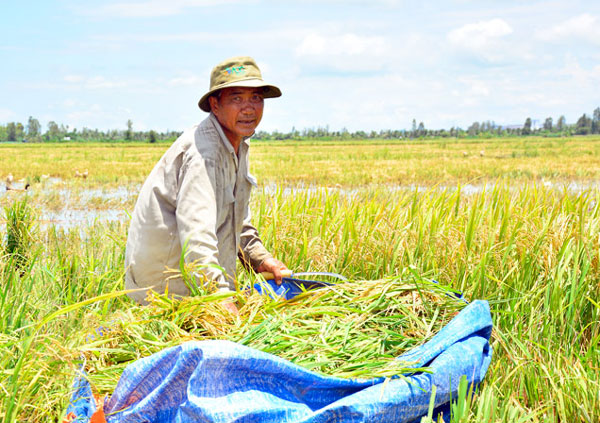 Ông Phan Hồng Tấn (63 tuổi, ngụ ấp Tân Lợi, xã Tân Thành), cho biết: “Còn 6 ngày nữa mới đến thu hoạch nhưng phải cắt lúa non bán với giá 4.500 đồng/kg, thấp hơn 600 đồng/kg so giá thương lái đặt cọc trước đó. Tính ra vụ này không lãi đồng nào vì chi phí bơm tát tăng quá cao”.