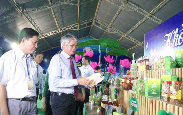 Phó Chủ tịch UBND tỉnh Đồng Tháp Châu Hồng Phúc tham quan các gian hàng sản phẩm khởi nghiệp tại hội chợ