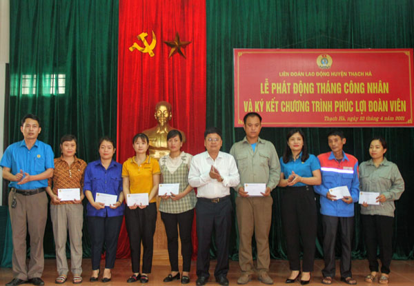 Cũng tại Lễ phát động, Liên đoàn Lao động huyện Thạch Hà đã trao 8 suất quà, mỗi suất trị giá 300 ngàn đồng cho các gia đình đoàn viên công đoàn có hoàn cảnh khó khăn.