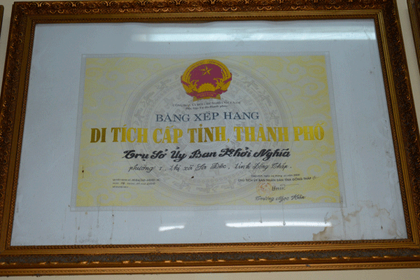 Bằng xếp hạng Di tích cấp tỉnh đối với Trụ sở Ủy ban Khởi nghĩa đang treo tại Phòng Văn hóa và Thông tin TP.Sa Đéc