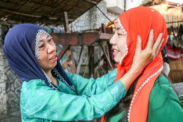 Nghệ nhân người Chăm đến từ An Giang (trái) hướng dẫn khách đội khăn Khanh-ma-om.