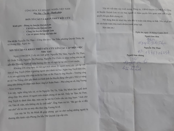 Đơn kêu cứu của người dân gửi đến cơ quan chức năng huyện Quỳnh Lưu