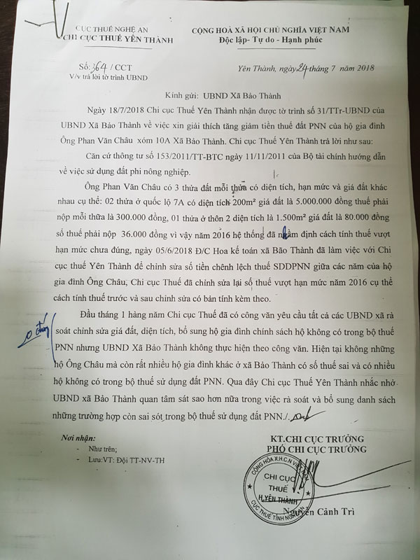 Đến ngày 24/7 Chi cục thuế Yên Thành đã có công văn số 364/CCT gửi UBND xã Bảo Thành.