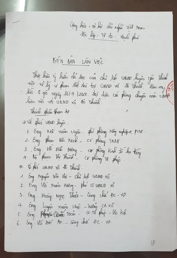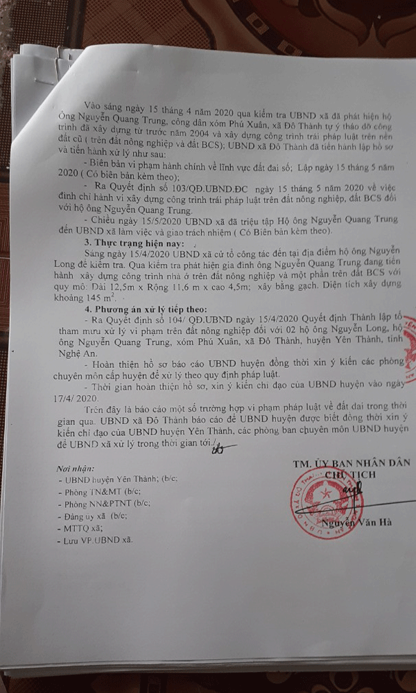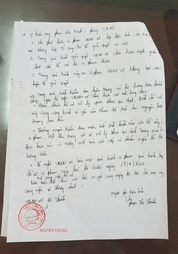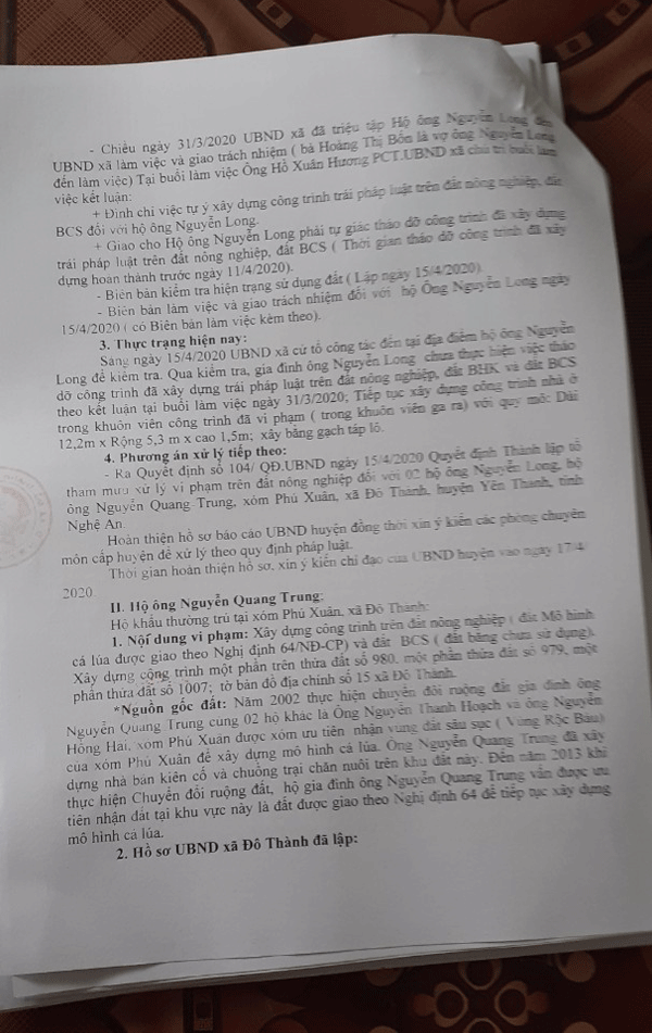 Trong biên bản làm việc của UBND xã Đô Thành, Phòng TN&MT huyện Yên Thành, Phòng Nông nghiệp và phòng KTHT huyện ngày 16/4 với 2 hộ dân liên quan là ông Nguyễn Long và Nguyễn Quang Trung, ông Nguyễn Văn Minh - chuyên viên phòng TNMT huyện Yên Thành cho rằng: “Khi phát hiện vi phạm, UBND xã đã lập biên bản, ra quyết định nhưng không lập tổ công tác để giải quyết sự việc. Và trong quá trình giải quyết UBND xã Đô Thành chưa kiên quyết, chưa giám sát chặt để các hộ dân vi phạm thêm. Đồng thời không báo cáo huyện để giải quyết”.