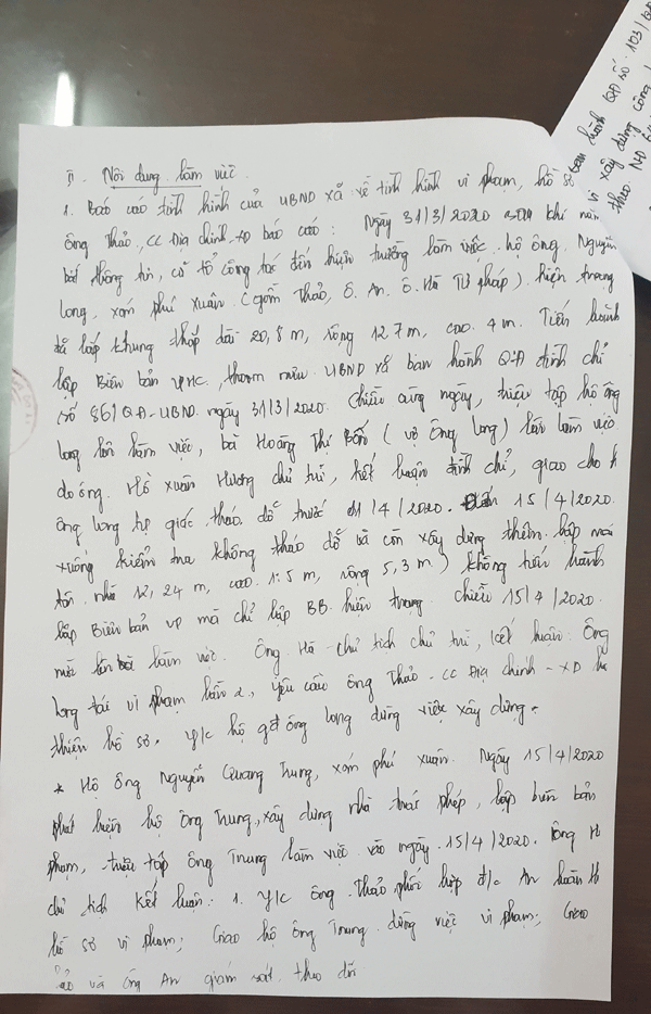 Điều đặc biệt, sau khi mời lên xã để làm việc, rồi đình chỉ công trình sai phạm, giao tự tháo dỡ nhưng hộ ông Nguyễn Long và ông Nguyễn Quang Trung không những không thực hiện mà còn “lấn tới” tiếp tục xây dựng phần công trình đang dở dang.