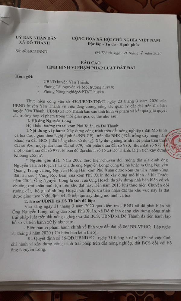 Sau khi nhận được thông tin, sáng ngày 31/3/2020, UBND xã Đô Thành đã kiểm tra và quyết định lập biên bản hành chính số 86/QĐ.UBND.ĐC với hộ ông Nguyễn Long. Chiều cùng ngày, UBND xã Đô Thành đã đình chỉ việc xây dựng công trình trái phép trên đất nông nghiệp, đất BCS và giao trách nhiệm với hộ ông Nguyễn Long phải tự giác tháo dỡ công trình trước ngày 11/4.