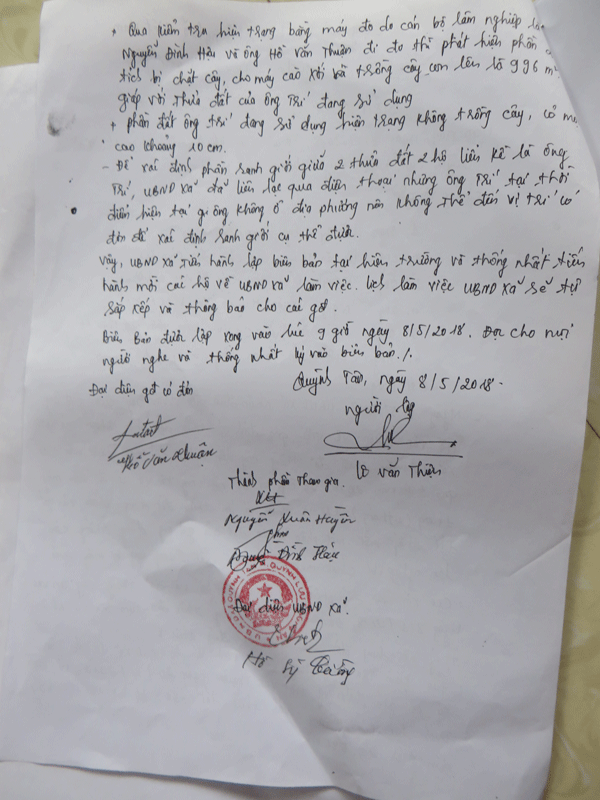 Sau nhiều lần tổ chức đo đạc xác định vị trí và diện tích đất rừng bị lấn chiếm của anh Thuận, chính quyền địa phương đã ra văn bản yêu cầu anh Trí thực hiện và anh Trí vẫn bỏ mặc không hợp tác.