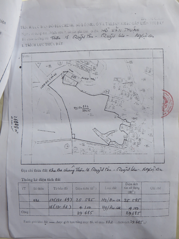 Được biết ngoài việc đất rừng bị lấn chiếm, cướp trắng trợn, cây rừng bị phá hoại thì theo hồ sơ giao đất của anh Thuận hoàn toàn hợp pháp, trong khi đó hộ anh Trí chỉ khai hoang mé rừng và không có hồ sơ khoán thầu, giao nhận nhưng diện tích “khai hoang” của anh Trí đã tăng trùng khớp với diện tích rừng anh Thuận bị mất.