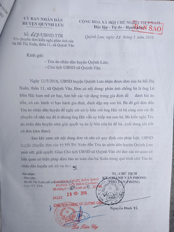 Trước những tố cáo của chị Xuân cũng như báo chí vào cuộc điều tra, đưa tin, UBND huyện Quỳnh Lưu lúc đó (năm 2016 - PV) có công văn số 667/UBND giao “Chủ tịch UBND xã Quỳnh Văn chỉ đạo các cơ quan liên quan có biện pháp đảm bảo an toàn cho chị Xuân”.