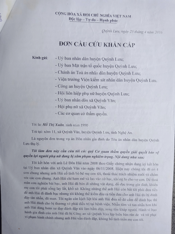 Đơn kêu cứu của chị Hồ Thị Xuân gửi các cơ quan chức năng