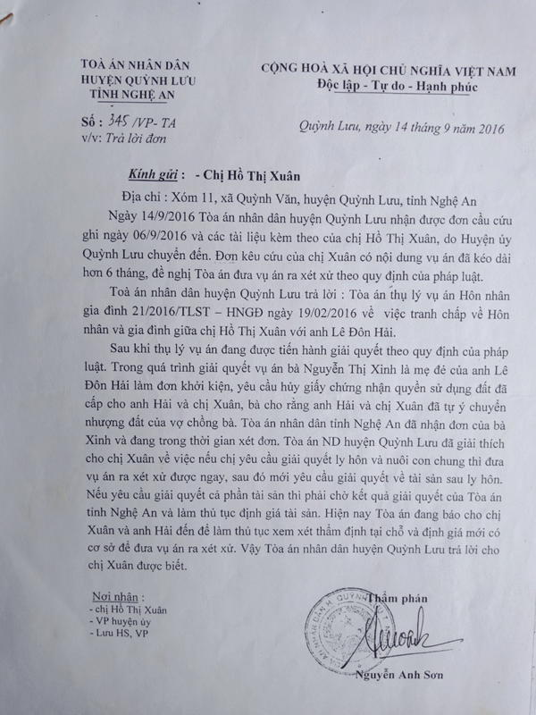 Chị Xuân bức xúc cho hay: “Sau 8 tháng thụ lý vụ án số 21/2016/TLST-HNGĐ, tôi không thấy TAND huyện Quỳnh Lưu đưa vụ án ra giải quyết, trong khi Lê Đôn Hải suốt ngày chửi bới, đe dọa, 4 đứa con nheo nhóc thiếu ăn, thiếu học nên đã gửi đơn cầu cứu đến các cơ quan chức năng huyện Quỳnh Lưu, tỉnh Nghệ An. Ngày 14/9/2016 Thẩm phán Nguyễn Anh Sơn - cán bộ trực tiếp thụ lý vụ án trước đó có đơn trả lời tôi rằng: “Trong quá trình giải quyết vụ án bà Nguyễn Thị Xinh là mẹ đẻ của anh Lê Đôn Hải làm đơn khởi kiện, yêu cầu hủy GCN QSDĐ đã cấp cho anh Hải và chị Xuân, bà cho rằng anh Hải và chị Xuân đã tự ý chuyển nhượng đất của vợ chồng bà. TAND tỉnh Nghệ An đã nhận đơn của bà Xinh và đang trong thời gian xét đơn. TAND đã giải thích cho chị Xuân về việc nếu chị yêu cầu giải quyết li hôn và nuôi con chung thì đưa vụ án ra xét xử được ngay, sau đó mới yêu cầu giải quyết về tài sản sau ly hôn. Nếu yêu cầu giải quyết cả phần tài sản thì phải chờ kết quả giải quyết của Tòa án tỉnh Nghệ An và làm thủ tục định giá tài sản”.