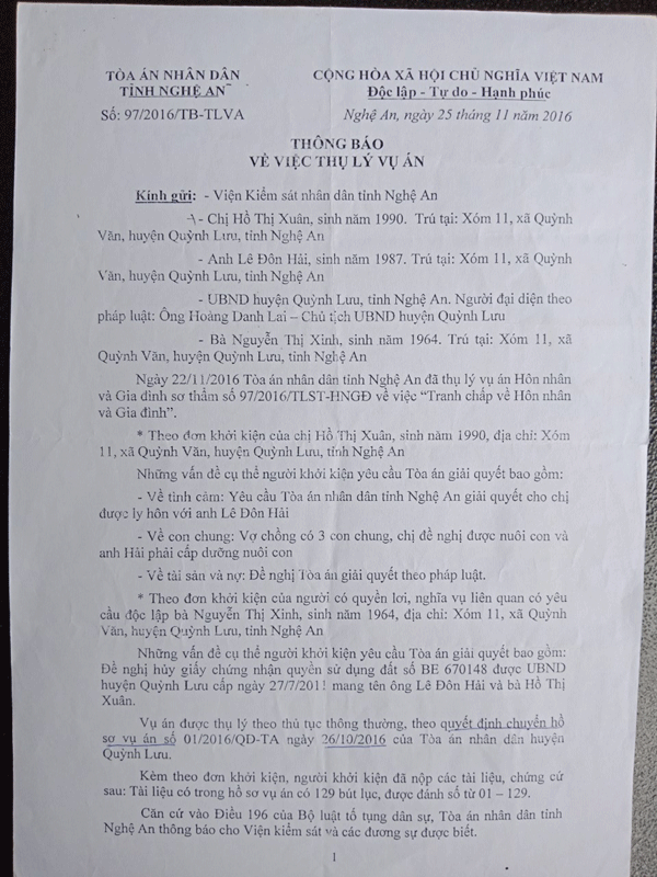 Ngày 22/11/2016 TAND tỉnh Nghệ An đã thụ lý vụ án Hôn nhân và gia đình sơ thẩm số 97/2016/TLST-HNGĐ do thẩm phán Nguyễn Đăng Phồn phụ trách. Theo đó thì “Vụ án được thụ lý theo thủ tục thông thường, theo quyết định chuyển hồ sơ vụ án số 01/2016/QĐ-TA ngày 26/10/2016 của TAND huyện Quỳnh Lưu”. Tuy nhiên không hiểu vì “lí do” gì, từ khi thụ lý vụ án của chị Xuân cho tới nay đã gần 3 năm, TAND tỉnh Nghệ An vẫn chưa đưa vụ án ra xét xử?!