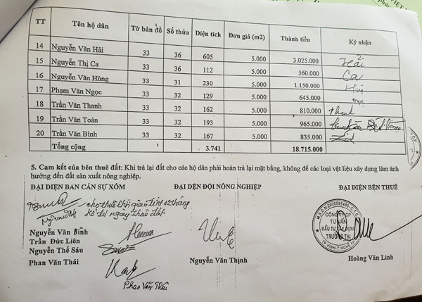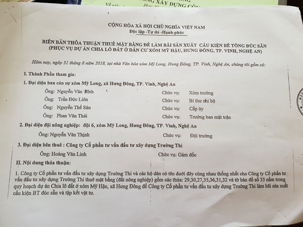 Theo đó, nội dung biên bản thỏa thuận là 20 hộ dân cho Công ty Cổ phần tư vấn đầu tư xây dựng Trường Thi thuê mặt bằng (đất nông nghiệp) gồm các thửa: 29, 30, 27, 35, 36, 31, 32 và Tờ bản đồ số 33 nằm trong quy hoạch dự án chia lô đất ở xóm Mỹ Hậu (Hưng Đông, TP Vinh) làm bãi sản xuất cấu kiện bê tông đúc sẵn và tập kết vật tư, với đơn giá là 5.000đ/m2.
