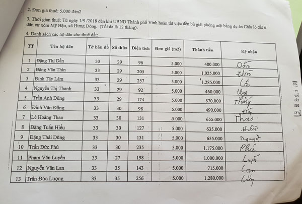 Trong biên bản cũng ghi rõ, thời gian mà Công ty Cổ phần tư vấn đầu tư xây dựng Trường Thi thuê của dân là từ ngày 1/9/2018 đến khi UBND TP Vinh hoàn tất việc đền bù giải phóng mặt bằng dự án chia lô đất ở dân cư xóm Mỹ Hậu, Hưng Đông (tối đa là 12 tháng). Và bên thuê là khi trả lại đất cho các hộ dân phải hoàn trả lại mặt bằng, không để vật liệu xây dựng ảnh hưởng đến sản xuất nông nghiệp.