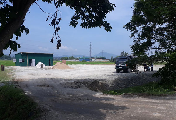 Tại hiện trường, Công ty Cổ phần tư vấn đầu tư xây dựng Trường Thi đã san lấp gần hết 2.500m2 đất nông nghiệp và có dựng một lán trại tại điểm san lấp. Vật liệu san lấp là đá bây.