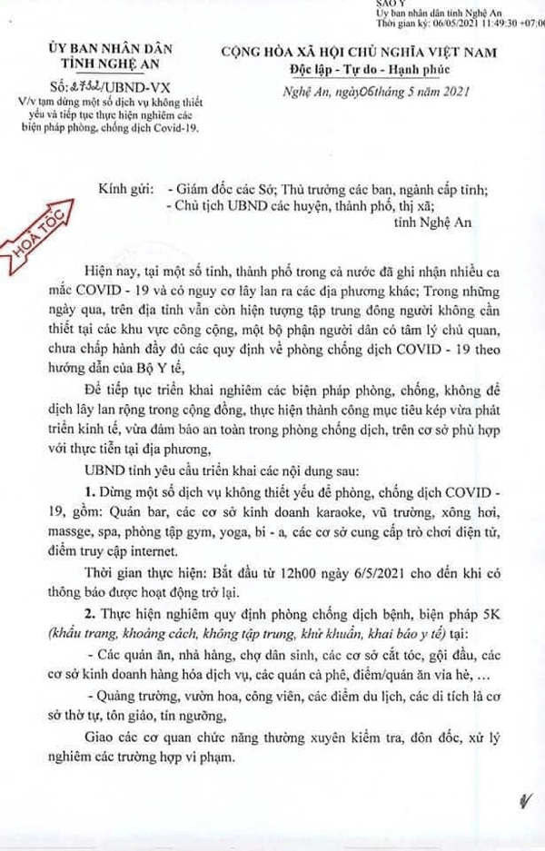 Cụ thể, dừng một số dịch vụ không thiết yếu để phòng, chống dịch COVID - 19. Đối: Quán bar, các cơ sở kinh doanh karaoke, vũ trường, xông hơi, massage, spa, phòng tập gym, yoga, bi a các cơ sở cung cấp trở chơi điện tử, điểm truy cập internet.
