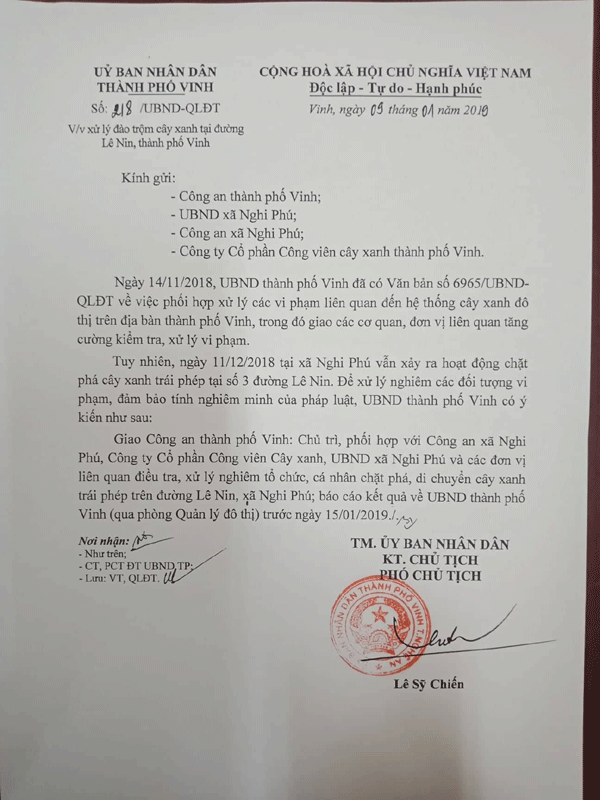 Sau khi báo chí, công luận lên tiếng, ngày 9/1/2019, ông Lê Sỹ Chiến - Phó Chủ tịch UBND TP Vinh đã nhanh chóng có văn bản số 218/UBND-QLĐT chỉ đạo các cơ quan chức năng nhanh chóng vào cuộc điều tra, xử lý. Công văn nêu rõ: “Ngày 11/12/2018, tại xã Nghi Phú xảy ra hoạt động chặt phá cây xanh trái phép tại số 03 Đại lộ Lê Nin. Để xử lý nghiêm các đối tượng vi phạm, đảm bảo tính nghiêm minh của pháp luật, UBND TP Vinh có ý kiến như sau: “Giao công an thành phố Vinh chủ trì, phối hợp với công an xã Nghi Phú, Công ty cổ phần công viên cây xanh, UBND xã Nghi phú và các đơn vị liên quan điều tra, xử lý nghiêm tổ chức, cá nhân chặt phá, di chuyển cây xanh trái phép trên đường Lê Nin, xã Nghi Phú, báo cáo về UBND TP Vinh (qua phòng QLĐT) trước ngày 15/1/2019”.