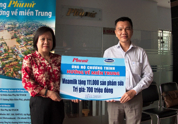 Cụ thể, hơn 111.000 sản phẩm dinh dưỡng đã được Vinamilk trao tặng bà con vùng lũ tại 7 tỉnh Quảng Trị, Thừa Thiên Huế, Bình Định, Quảng Nam, Đà Nẵng, Quảng Bình, Hà Tĩnh thông qua chương trình “Hướng về Miền Trung” của Báo Phụ nữ TP.HCM. Trong thời gian tới, các khoản hỗ trợ tiền mặt và sản phẩm dinh dưỡng sẽ được Vinamilk tiếp tục đưa đến bà con vùng lũ.