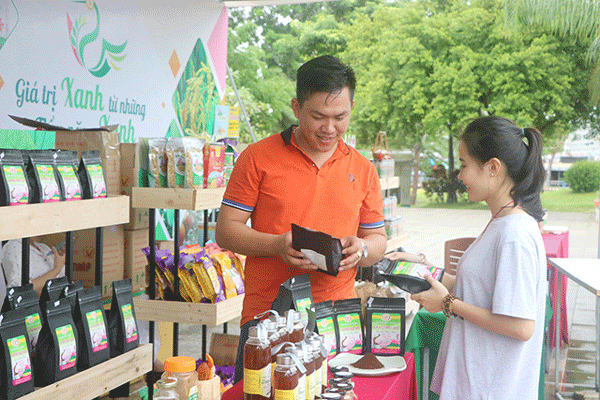 Anh Lê Thanh Tuấn giới thiệu sản phẩm cà phê hạt sen cho người tiêu dùng tại buổi triển lãm thành tựu kinh tế - xã hội của tỉnh năm 2020