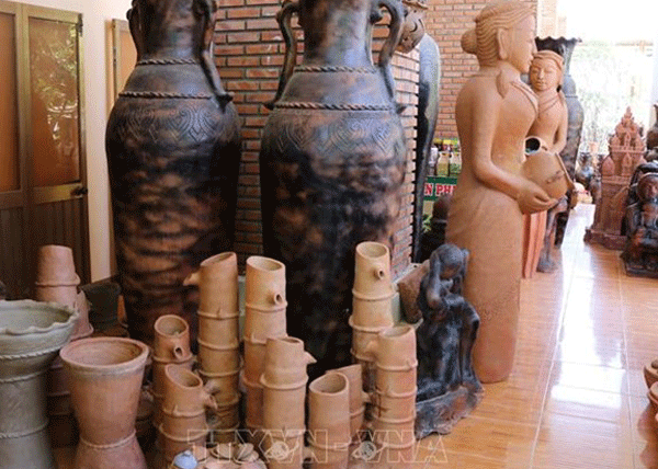 Hợp tác xã gốm Chăm Bàu Trúc (thị trấn Phước Dân, huyện Ninh Phước) có nhiều cách làm sáng tạo, kết hợp các yếu tố văn hóa phương Tây, văn hóa Việt vào trong sản phẩm để cải tiến kiểu dáng, chất lượng sản phẩm. Ảnh: Nguyễn Thành.
