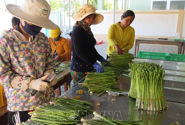 Xã viên Hợp tác xã dịch vụ tổng hợp Tuấn Tú (xã An Hải, huyện Ninh Phước) sơ chế sản phẩm đặc thù măng tây xanh để đưa đi tiêu thụ. Ảnh: Nguyễn Thành – TTXVN