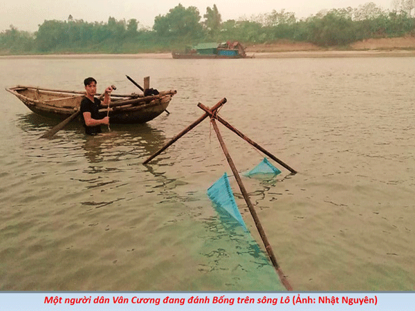 Tuy nhiên, những người dân thuộc làng Vân Cương lại có phương thức đánh bắt cá Bống truyền thống độc đáo và lý thú. Đồ nghề để đi đánh Bống trên sông hết sức đơn giản chỉ bao gồm đoạn dây Sò dài chừng 100m, màn Bống tự chế và một chiếc thuyền nan nhỏ. Dây Sò được kết từ vỏ của con Sò thường là từ vùng biển Quảng Ninh đem về đục lỗ rồi xỏ dây. Màn bống được may từ những chiếc màn tuyn cũ gắn vào ba cây tre nhỏ tạo thành thế chân kiềng. Còn thuyền thì được đan từ tre sau đó dùng vữa xi măng và cát trát lại để chống ngấm nước.